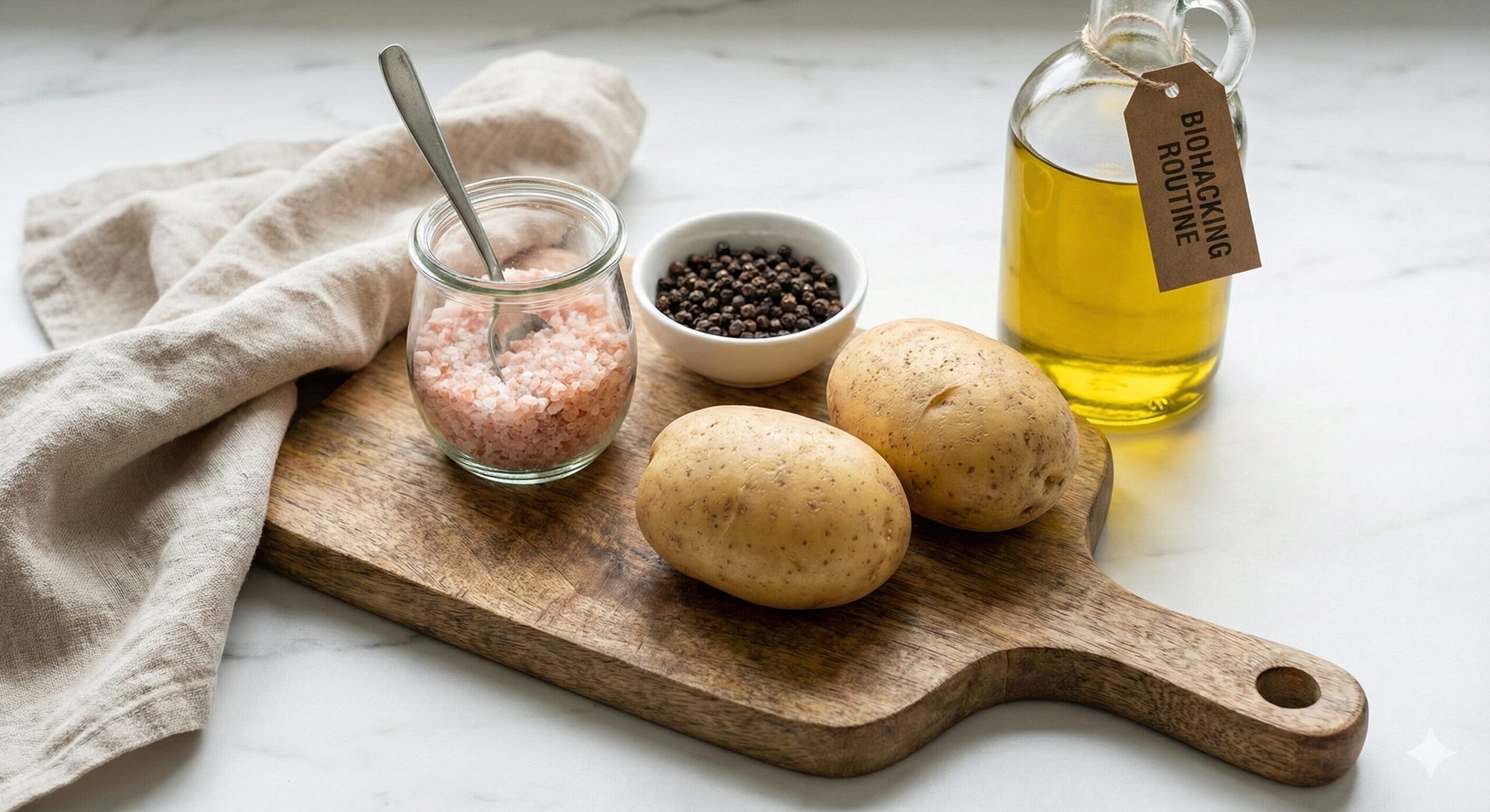 Fresh potatoes with skin on, pink salt, black pepper, and olive oil prepared for biohacking recipe.